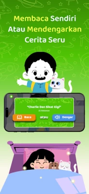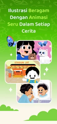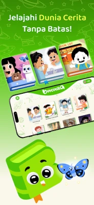 - Dongeng Interaktif & Audio Narasi: Anak dapat menikmati cerita dengan membaca sendiri atau mendengarkan narasi audio, membuat pengalaman mendongeng menjadi lebih hidup dan seru.