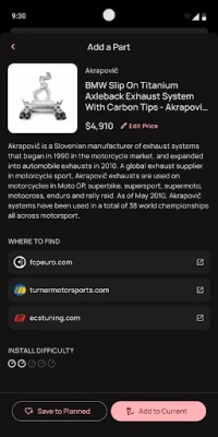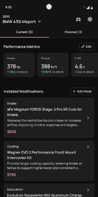 • Vehicle-Specific Parts – Add your car using VIN or manual entry to receive compatible mod recommendations