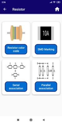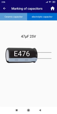 - Color code of resistors - Marking of SMD resistors - Series resistors - Resistors in parallel - Capacity of a capacitor - Marking of ceramic and electrolic capacitors - Serial capacity - Parallel capacity - Marking of inductors (Coils) - Series inductor - Capacitive reactance (Xc) - Series impedance - Inductive reactance (Xl) - Inductor in parallel - Impedance in parallel.